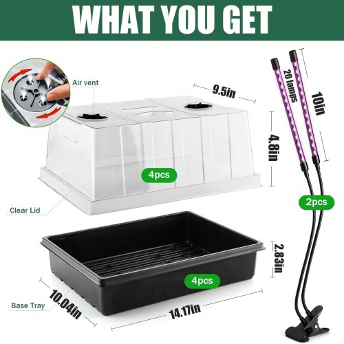 - 【Reusable Trays & High-Dome Humidity Covers】Made from thick, long-lasting plastic, the seed trays and snap-on humidity domes are reusable season after season. Adjustable air vents let you control humidity and airflow to create the perfect microclimate for sprouting seeds and growing strong seedlings.