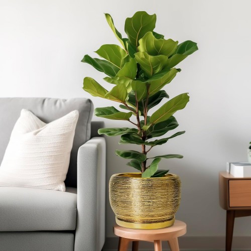 SQOWL Ceramic Planter for Indoor Plants – 10 Inch Plant Pot with Drainage Hole and Saucer, Modern Round Planter Outdoor, Large Decorative Flower Pot, Apartment Decor, Birthday Gifts, Gold