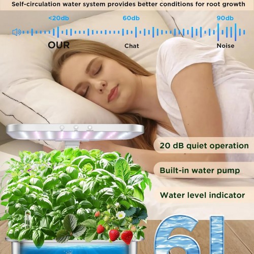- 15 Pods, Fast growth: This indoor garden system features 15 planting pods and a 6L water tank with a built-in pump ,ensures peaceful indoor gardening, perfect for bedrooms or kitchens,The indoor plant growing system simulates sunlight,which create a good growth environment for plants