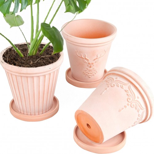 Sungmor Set of 3 Terra Cotta Pots With Saucer & Drainage Hole – 8 Inch Large & Deep Clay Planters, Unique Embossed & Pretty Color Pottery for Plants, Orchid, Cactus, Succulent