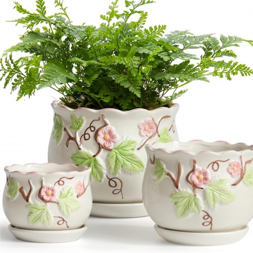- LARGE CERAMIC PLANTERS: These decorative planters for indoor plants are a great size for growing flowers, greenery, or herbs. Each 12″ plant pot measures 10.5″ inner top diameter (12″ outer top diameter) x 4″ inner bottom diameter (6″ outer bottom diameter) x 9.5″ H (inner) (10″ outer) and weighs 11.4 lbs. They can hold up to 1.8 gallons/0.24 cubic feet/232 ounces of soil each. Each planter has (1) 1″ drainage hole to allow excess water out.