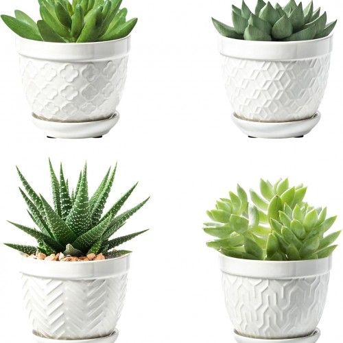 - Minimalist Design of Houseplant Pot: These indoor planters are designed with four different embossed patterns that make it easy to mix and match plants to create a elegant look, decorating windowsill, tabletop, shelve, kitchen, living room, bedroom, office, garden and patio. These flowerpots have a minimalist design and combination solid color glaze that blend seamlessly with a various of home styles