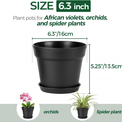 T4U 6 Inch Plant Pot 8-Pack, Plastic Planter with Drainage Hole and Saucer, Decorative Nursery Pots Bulk for African Violet, Snake Plant, Succulent, Herb and Plants Indoor (8 Pcs 6″ Pots, Black)
