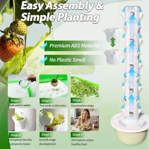 - 【Easy to Assemble and Clean】The hydroponic growing system tower has stackable modules and a 30L base bucket for added stability. Adjust the height as needed. Simply disassemble the hydroponics growing tower and rinse it with water for easy cleaning