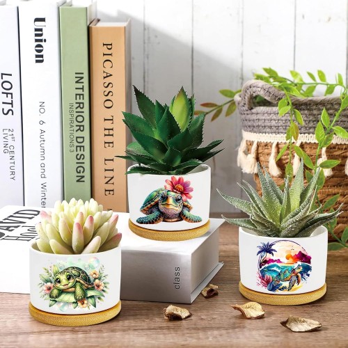 Turtle Succulent Pots 3 Pack, 3 Inch Succulent Planters with Drainage and Bamboo Tray, Turtle Gifts for Women, Ceramic Small Pots for Baby Plants, Cactus, Herbs- Plants Not Included