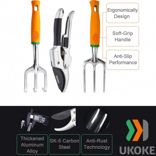 Ukoke UGP01G-7 Outdoor Tool, Heavy Duty Work Ergonomic Handle, for Women Men Set, 7 Piece Aluminum Kit, Garden Canvas Apron with Storage Pock, Orange
