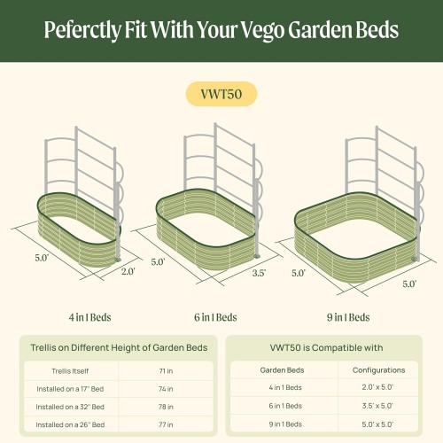 Vego Garden Modular Wall Trellis System, Triple Section 5.0′ Long for 2.0′ x 5.0′ (4 in 1) or 3.5′ x 5.0′ (6 in 1) or 5.0′ x 5.0′ (9 in 1) Garden Beds