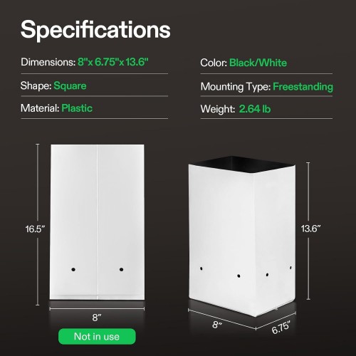 - Stability & Lightweight: The VIVOSUN Black-and-White Grow Bags have notches on its sides to keep it upright and stable when filled; It is portable, lightweight, foldable, and very easy to store; The dimensions are 8” x 6.5” x 16.5”; We offer multiple sizes