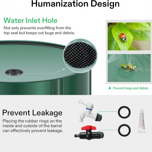 - Crafted Design: The top mesh not only prevents overfilling from the top seal but keeps out debris; The high flow spigot can fill small containers such as buckets and spray cans; The downspout spigot can connect to a hose to water your plants