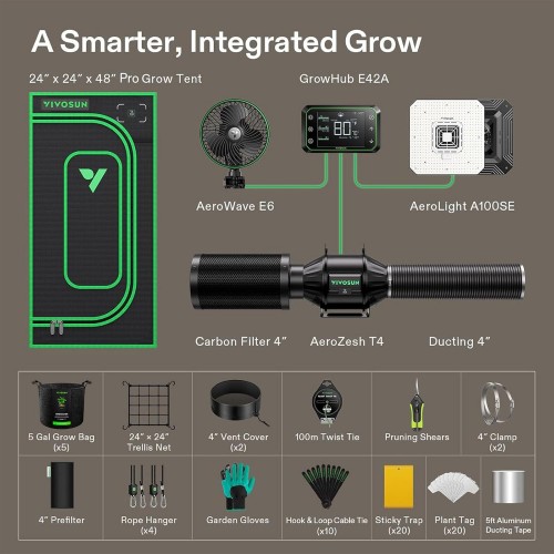 - Complete Plus Kit Included: 24″x24″x48″ PRO Grow Tent; AeroLight A100SE 100W LED Grow Light; AeroZesh T4 4″ Duct Fan; AeroWave E6 Clip Fan; GrowHub E42A Controller; 4″ Carbon Filter; 4″ Prefilter; 4″ 8ft Ducting; 4″ Clamp×2; 24”×24” Trellis Net; 5 Gal Grow Bag×5; 4″ Vent Cover×2; Pruning Shears; 100m Twist Tie; Sticky Trap×20; Plant Tag×20; Hook & Loop Cable Tie×10; 5ft Aluminum Ducting Tape; Garden Gloves; Rope Hanger×4