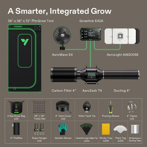 - Complete Plus Kit Included: 36″x36″x72″ PRO Grow Tent; AeroLight AW200SE 200W LED Grow Light; AeroZesh T4 4″ Duct Fan; AeroWave E6 Clip Fan; GrowHub E42A Controller; 4″ Carbon Filter; 4″ Prefilter; 4″ 8ft Ducting; 4″ Clamp×2; 36”×36” Trellis Net; 5 Gal Grow Bag×5; 4″ Vent Cover×2; Pruning Shears; 100m Twist Tie; Sticky Trap×20; Plant Tag×20; Hook & Loop Cable Tie×10; 5ft Aluminum Ducting Tape; Garden Gloves; Rope Hanger×4