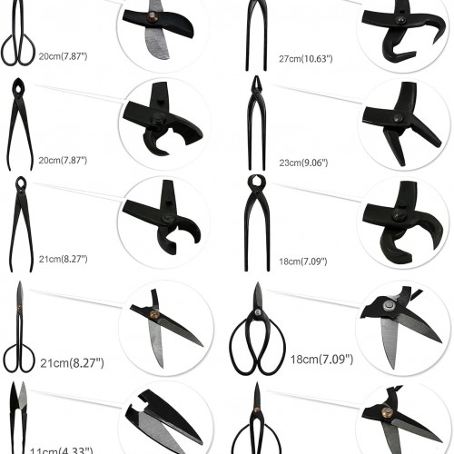 - Complete 14PCS Bonsai Tools Set – including Leaf Trimmer, Bud Shear, Cutting Scissor, Concave Cutter, Knob Cutter, Wire Cutter, Root Cutter, Jin Pliers, Trunk Splitter, Root Hook, Rake with Spatula, Branch Bender, Hemp Broom, Wire, Nylon Tool Case