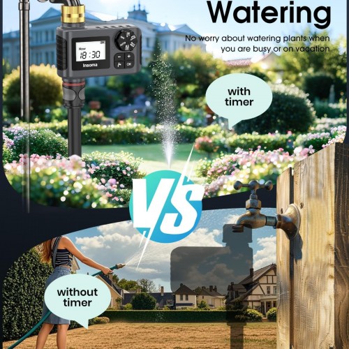 - 【Upgraded Waterproof & Durable】Insoma water hose timer is made of IP55 waterproof material with 2025 upgrade waterproof technology and added a seal ring in the battery cover to prevent water leakage better. Upgraded pure brass water inlet is stronger and more durable than plastic inlet, and it is not easily deformed due to long-term use or high temperature exposure. The Built-in metal filter can effectively prevent sediment and other larger particles from entering the irrigation system.
