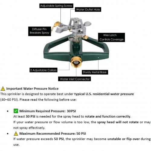 - 【ALL METAL DESIGN FOR DURABILITY】Both the base and the head of this impact sprinkler are constructed from long-lasting zinc alloy. Zinc alloy makes the sprinkler resistant to rust and corrosion. And its all-metal construction is designed to hold up against the typical wear and tear that most impact sprinklers experience, like moisture and severe weather conditions, giving you years of dependable use.