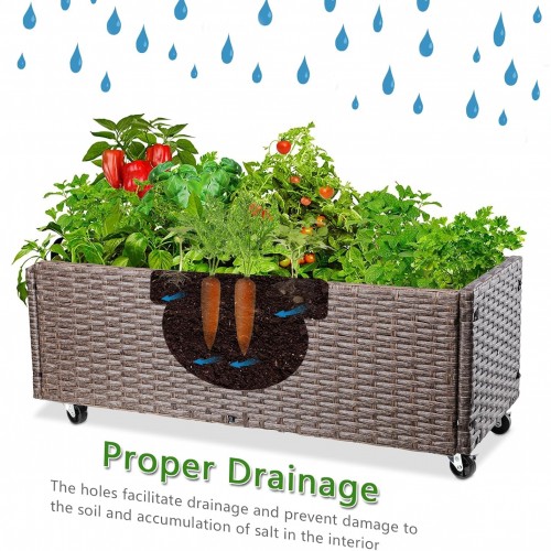 - {Double-sided simulated plastic Material} The material of the raised garden bed is simulated rattan, and it is double-sided, different from the single-sided on the market, with a smooth surface and no burrs. The bottom shelf provides extra storage space for garden tools, keeping tools and small flowerpots handy.