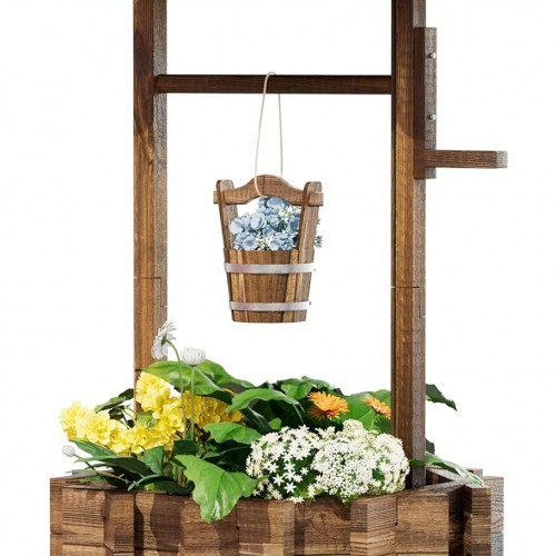 Wooden Wishing Well Planter for Outdoors with Hanging Bucket, Rustic Flower Planter Patio Garden Decorative, Brown (Brown)
